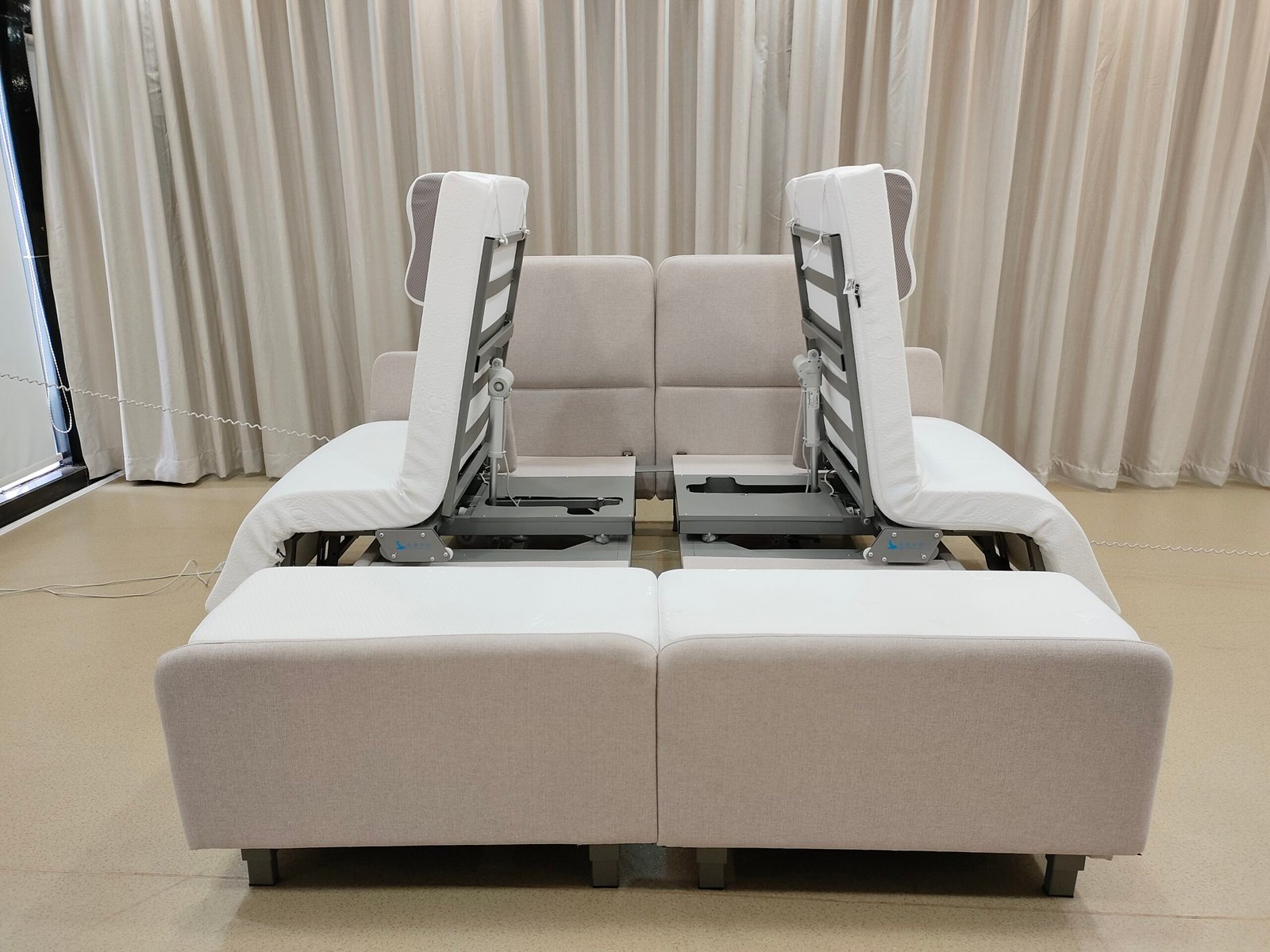 Combination of SPIN SINGLE and SPIN Relaxation. Only one side of the king size bed can be rotated. While the one of the couple benefits the rotating function, the other one can enjoy relaxation and entertainment in the bed.
